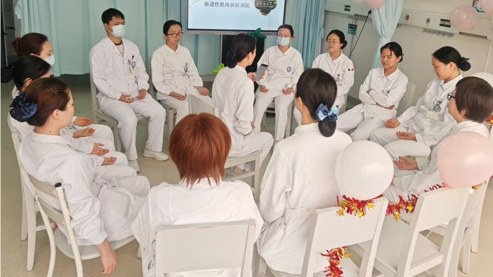 活动由科室的“阳光天使”张艳精心筹备,面向全体护理人员开展,旨在为朝夕相处的伙伴点亮一盏温暖的心灯。培训伊始,她以深入浅出的方式,展示了“渐进性肌肉放松法”背后蕴含的心理学原理与生理学基础。强调通过有意识、按顺序地对各主要肌群进行“紧张—保持—放松”的循环练习,帮助身心实现深度的释放与平衡。 当悠扬如溪流的音乐缓缓流淌,当轻柔如羽的引导语在耳边响起,时光仿佛被调慢了节拍。大家轻轻闭上双眼,从眉心开始,学着松开那些不自觉的“结”。紧绷的额头舒展开了,僵硬的肩颈柔软了,紧握的双手放松了……空气中弥漫着宁静的气息,只听见均匀的呼吸声此起彼伏,像潮汐般温柔而有节奏。那些平日里总是脚步匆匆的身影,此刻安坐如莲。当训练结束时,许多人睁开眼睛的刹那,眸子里闪烁着久违的清澈与安宁。在场护士均表示在训练中体会到了明显的身体轻松与情绪平静。