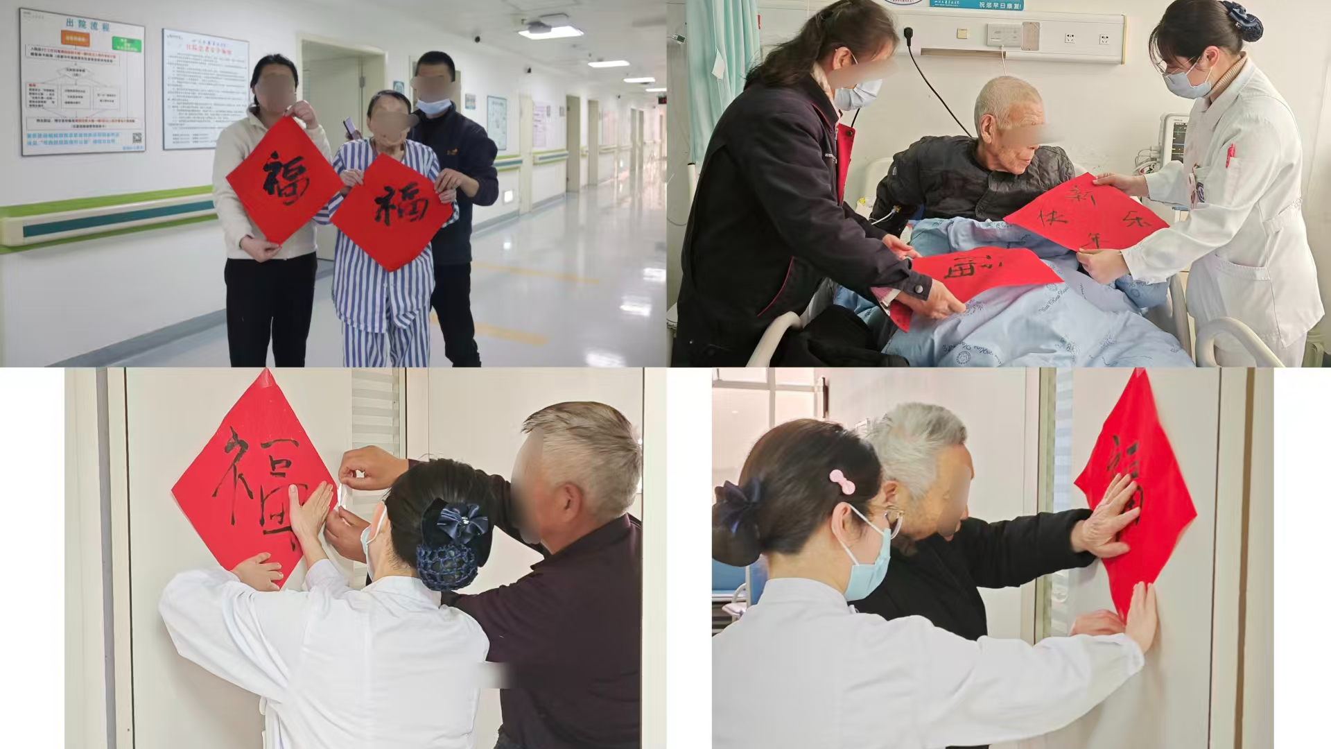护理团队将书写好的“福”字,连同真挚的祝愿,逐一送至每一位患者的床旁。在医护人员和志愿者的协助下,老年患者的家属将“福”字贴在病房门上——将平安、祥和的“福气”请到老年患者身边。