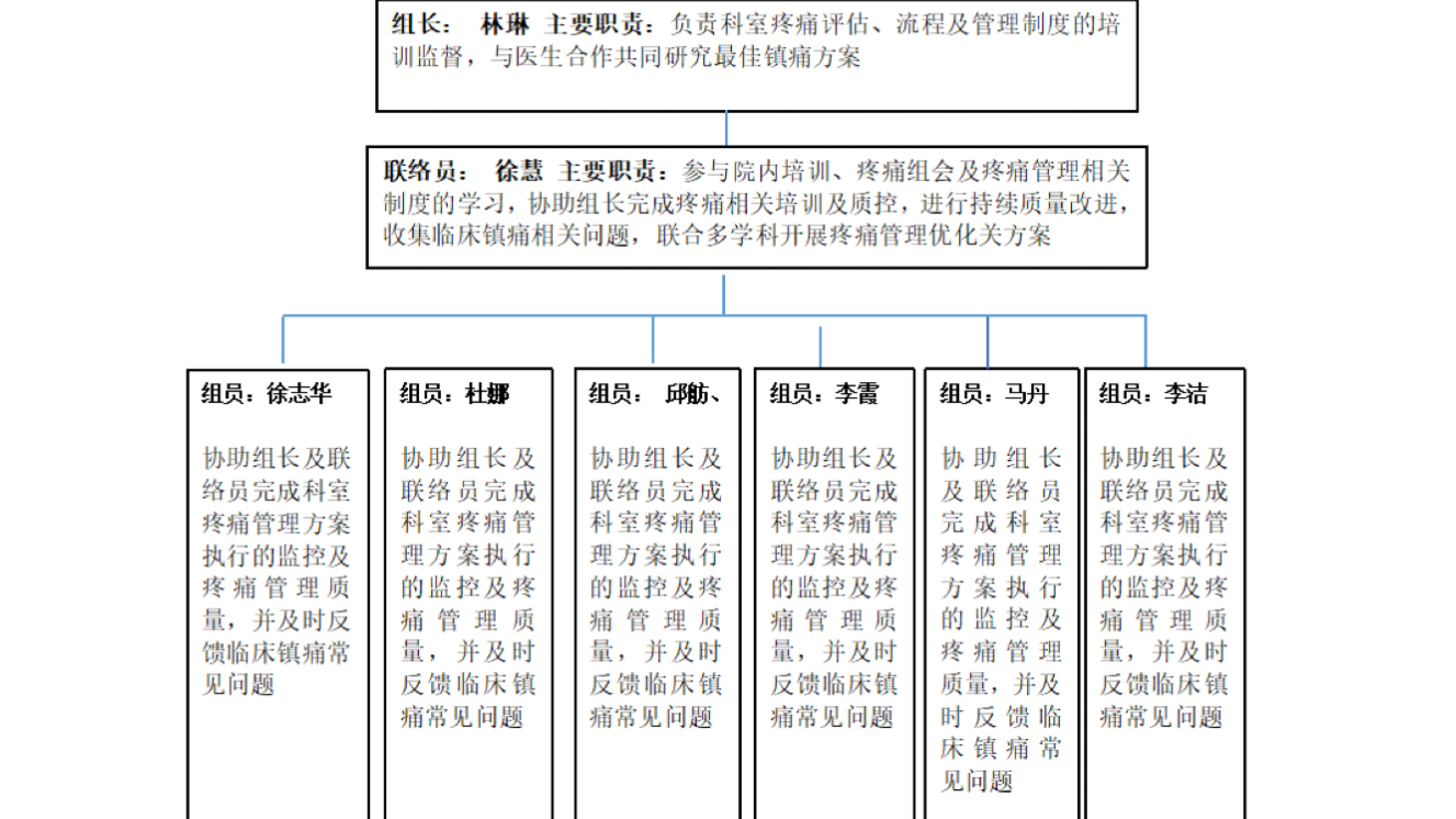 举措三:成立“胸外科疼痛管理小组” 由护士长、疼痛专科护士、护理组长组成专业团队。 主要人员及职责:护士长:负责科室疼痛评估、流程及疼痛管理培训监督,与医生、麻醉师商讨最佳疼痛方案,定期培训科室护士对疼痛知识的掌握,疼痛专科护士:定期参加院级以上的疼痛专科护士培训;护理组长:对患者疼痛评价及时反馈,协助护士长完成疼痛方案的管理及执行情况,特别是:镇痛方案实施效果不理想及时请疼痛科会诊,组织全院复杂疼痛患者的会诊;责任护士:指导术后镇痛泵(PCA)的使用与管理,处理镇痛药物的不良反应,并对临床护士进行培训和督导。
