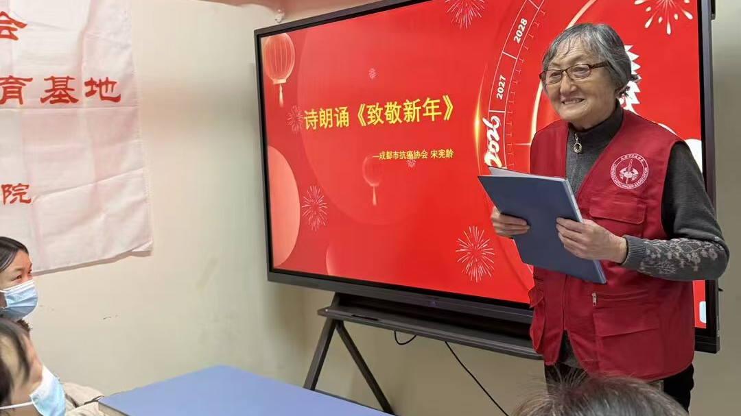 文艺环节温情满满。抗癌协会志愿者服务队员宋宪龄女士以两种艺术形式点燃全场:现代京剧《红灯记》选段:铿锵韵白再现红色经典,革命精神与抗癌意志交相辉映;诗歌《致敬新年》:柔声诵读中,“破茧成蝶”“向阳而生”等诗句引发强烈共鸣,掌声经久不息。