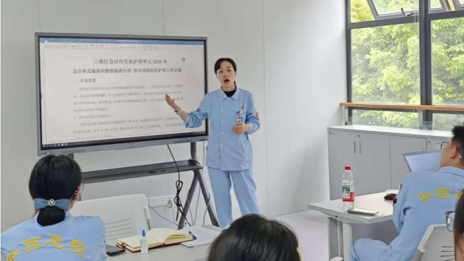 为落实 2026 年华西护理患者十大安全风险防控要求,有效防范静脉药物外渗、渗出所致患者损伤,持续提升静脉治疗护理质量,4 月 15 日,急诊科发热护理单元组织召开首次静疗管理专项会议。本次会议由张建娜护士长统筹部署,发热静疗小组组长马燕主持,全体静疗小组成员参会,护理组长王玲、科研组钟璐莹老师受邀参会指导。