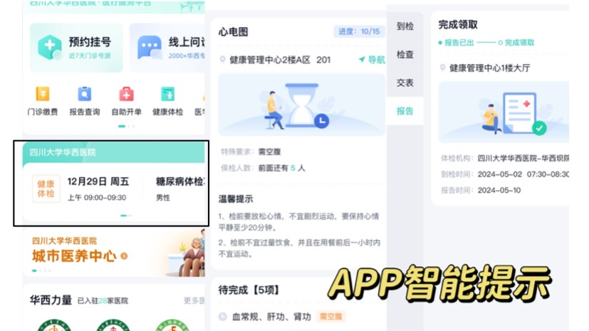 一、提速—智慧赋能,系统升级,流程优化 1.智能规划路径,动态优化流程 体检新系统突破传统单一排队模式,引入“多项目并行排队”机制。通过实时采集各科室人流量、项目平均耗时及体检者空腹状态等信息,自动为每位受检者生成个性化检查路线,大幅度减少折返跑与无效排队等待,缩短整体候检时间。 2.全流程可视化,进度实时可知 升级后的系统与医院挂号平台“华医通”同步数据互通,体检者可通过手机实时查看排队位次、科室等候人数及整体进度,使体检流程全程透明,缓解客户等候焦虑。 3.数据互联互通,报告查询提速 新系统深度融合检验信息系统、放射信息系统等后端平台,检查结果实时上传、自动整合。医生可即时调阅历史资料,提升诊断效率;体检者完成全部项目后,无需现场等候纸质报告,可通过手机快速获取电子版。