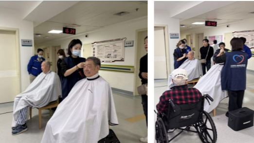 此外,病房积极整合社会资源,与北京同心圆慈善基金会合作,将专业理发服务送入病房,为行动不便的老年患者提供免费理发服务。志愿者们技艺娴熟、态度亲和,一推一剪之间,老人们不仅容貌焕然一新,更深切感受到来自医院与社会的温暖关怀,赢得患者及家属的高度认可。