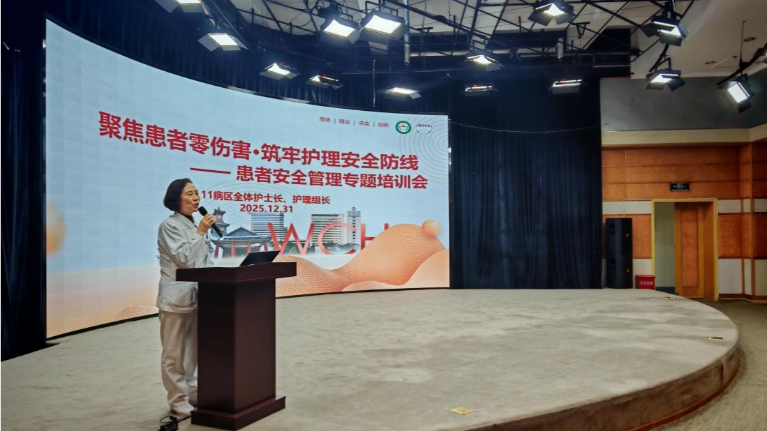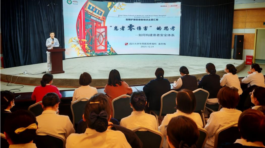 为强化护理管理者安全意识,构建更完善的患者安全护理管理体系,2025年12月31日下午,四川大学华西医院11病区在信息楼天使演播厅隆重召开患者安全专题培训会。本次培训以《患者零伤害的思考——构建患者安全体系》为主题,由疼痛科袁冬梅护士长主讲,冯梅科长莅临现场指导,十一病区全体护士长、护理组长参会。此次培训源于袁冬梅护士长参加首期护理管理者培训的实践思考,旨在凝聚共识、分享经验,切实提升病区患者安全管理水平。