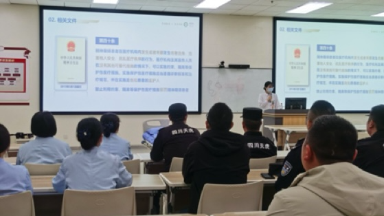 培训伊始,培训负责人白阳静病区副护士长首先感谢工勤安保人员对医护工作的大力支持,同时强调约束保护的核心理念:“约束保护绝非惩罚,而是在万不得已时,为预防患者伤害自身或他人、保证治疗顺利进行所采取的干预治疗。希望通过本次标准化的培训,大家掌握准确有效的技能,既能保护自己,同时不伤害患者,做到无伤害约束。”