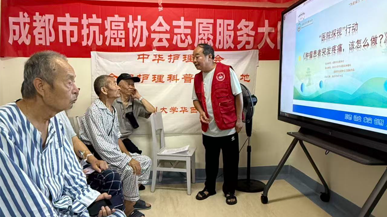 在全国科普月之际,四川大学华西医院胸部肿瘤病房与成都市抗癌协会携手,于近日在五住院部三楼健康教育室成功举办了一场题为《肿瘤患者突发疼痛,该怎么做》的科普活动。本次活动旨在提升患者对癌痛管理的认知,增强患者及家属的自我管理能力,进一步体现护理服务的专业性与人文关怀。
