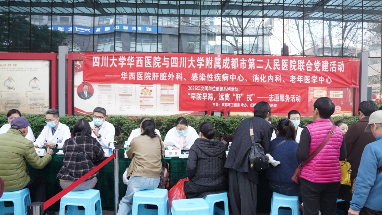 为迎接 3・18 全国爱肝日,切实提升市民肝脏健康防护意识,重点强化老年市民肝胆消化健康管理能力,3月11日,四川大学华西医院与四川大学附属成都市第二人民医院携手,联合华西医院多科室以共同开展以 “早防早筛,远离“肝”扰” 为主题的健康宣教与义诊活动。四川大学华西医院老年医学中心三病房积极响应南丁格尔行动号召,组建骨干医疗团队倾情参与,以专业的医疗力量为老年市民的肝脏健康保驾护航。