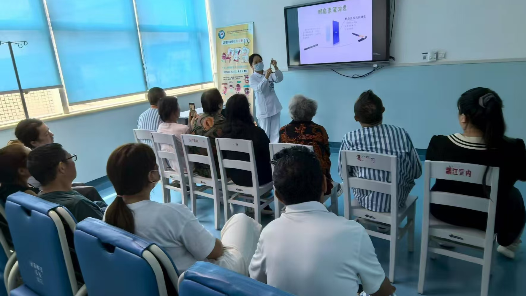 另外,科室护士还指导部分患者实操,手把手纠正不规范的操作细节,解答个性化问题。一位胰岛素治疗6年的老年患者操作后感慨:“原来注射后停留不足会让药液渗出!护士演示的捏皮手法和停留时间特别实用,这次真正掌握了‘精准'的要领。” 最后,温怡副护士长总结强调:“精准源于规范,安全始于细节,对糖肾患者而言,每一针胰岛素都关系着肾脏安危,我们开展“精准守护每一针,健康护航伴你身”《胰岛素笔安全注射》专题宣讲活动,就是要让规范操作成为患者的‘肌肉记忆',将安全注射转化为守护健康的坚实盾牌。 此次专题宣讲是病房践行"以患者为中心"服务理念的创新实践。病房将持续深化优质护理服务内涵,针对慢性病患者需求开发系列精品患教课程,将专业护理延伸至疾病管理每个环节,用精准技术和人文关怀守护患者生命健康。