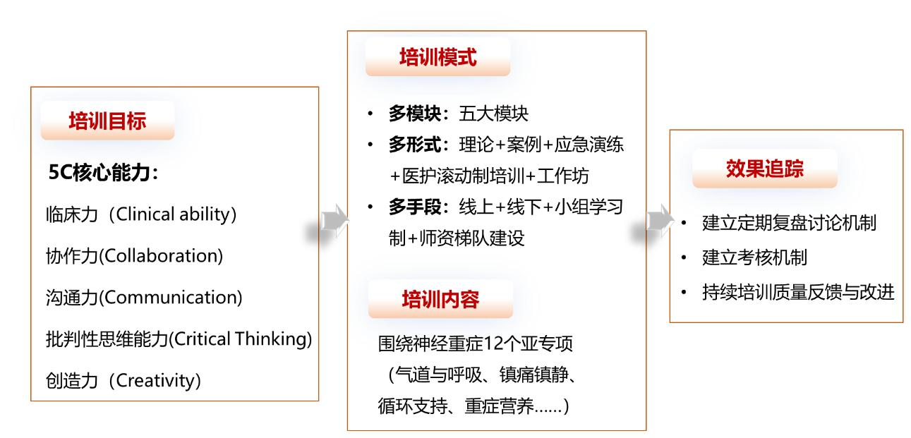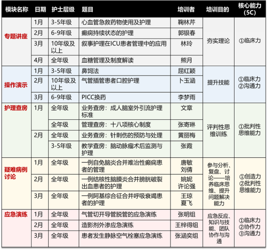 培训体系划分五大模块,突出神经重症专科内容,通过模块化管理和阶段性实施,护士分层级培训,围绕提升护士5C能力,将理论知识和临床实践深度融合。