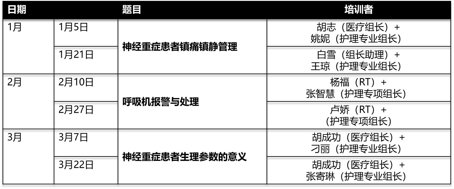 为提升护士对神经重症患者的综合管理能力,促进医疗与护理团队的协作,科室推出“滚动式培训”与“医护联合查房”的教学机制。该培训由医疗组长、组长助理及呼吸治疗师共同负责,每月围绕一个核心主题开展查房。为解决护士因临床事务繁忙难以统一参训的难题,科室采用重复授课模式,每月同一专题讲授两次,护士可根据排班情况任选一次参加。培训实施严格的签到与签退管理,以确保人员参与规范性,并于培训后设置专项考核,巩固和检验学习成效。该机制有效减轻了护士集中学习的压力,显著提高了培训参与率与整体教学效果,切实增强了医护协作与重症护理的同质化水平。医护也可以就最近大家出现问题点较多的环节进行医护联合讨论,发现各自薄弱和需要进一步培训的内容,作为三基三严培训的参考。