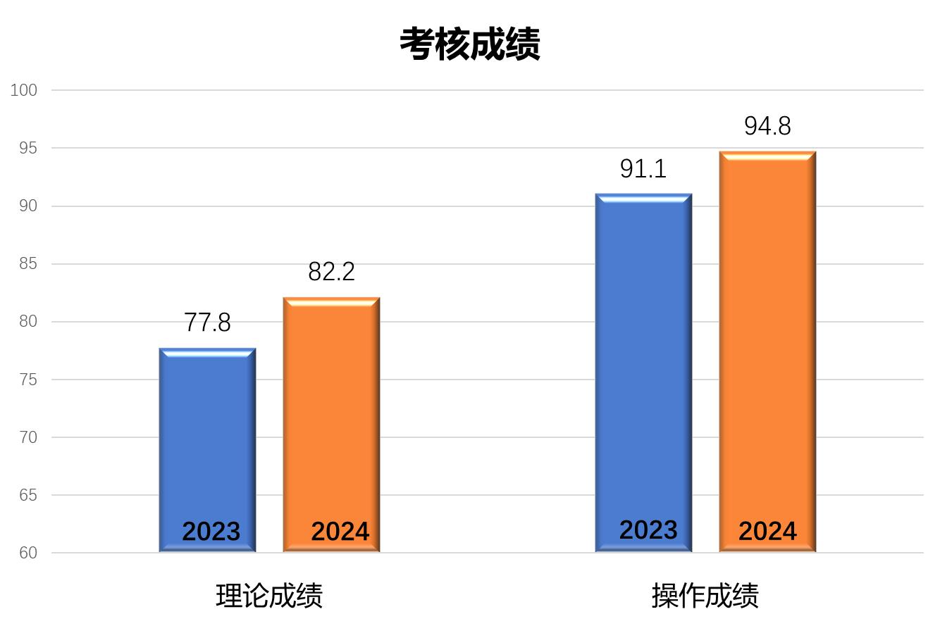 全年三基三严培训计划按期高质量完成,在职护士参与率达100%,整体通过率为100%。理论平均成绩由77.8分提高到82.2分,操作考核成绩由91.1分提高到94.8分。